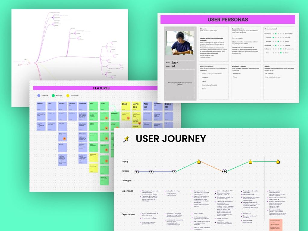 And with all this understanding, after many hours of dynamics following different concepts, we were able to understand the structure of the application and assemble the entire mind map and user journeys, thus defining which screens were necessary and how to build the entire navigation structure.